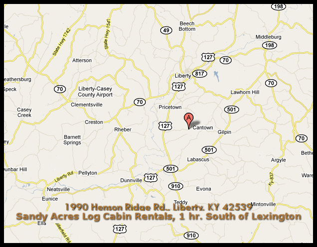 Sandy Acres, nestled in the majestic hills of Kentucky, is family owned and run. Our non-smoking log cabins have all the comforts of home! View each of our cabin pages to see which one fits your vacation needs. Whichever cabin you choose, we're sure you'll enjoy the screened windows to experience the clean mountain air, there is lots of land to roam, as well as plenty of room to park your trailer. We think you'll also enjoy the fire pit for night time bon fires & S'mores!